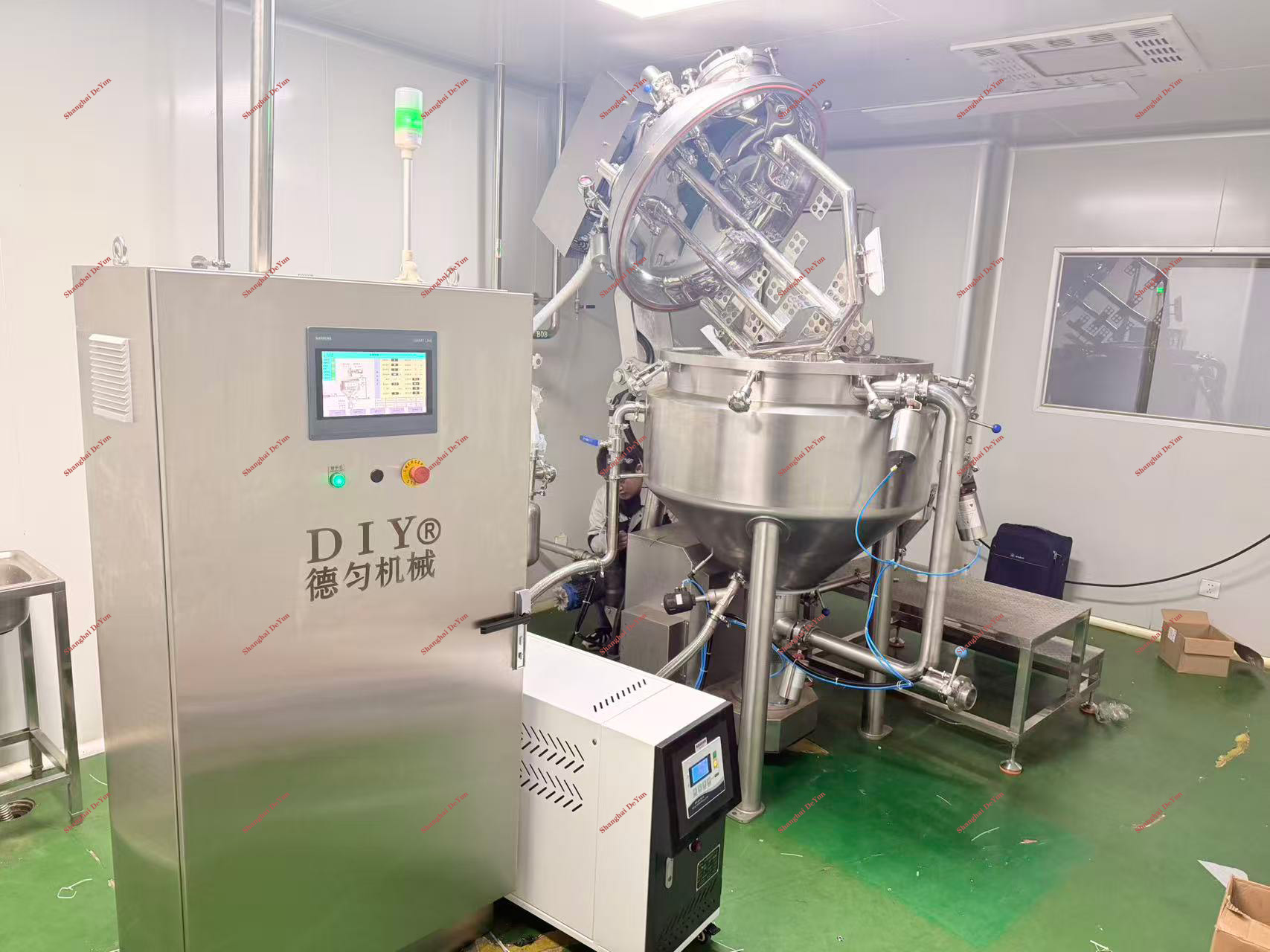 This is a newly developed device. It is mainly suitable for sites with insufficient trial space. The homogenizer has the functions of liquid and powder input at the bottom, and compared with IKA, its efficiency is much higher. This internal and external circulation vacuum emulsifier has the following features: 1. Multi-layer structure, uniform fineness; 2. Large flow rate, high efficiency; 3. Easy to clean. The stirring paddle adopts double-sided scrapers, which is better for cleaning the inner wall of the container and reduces the generation of bacteria.